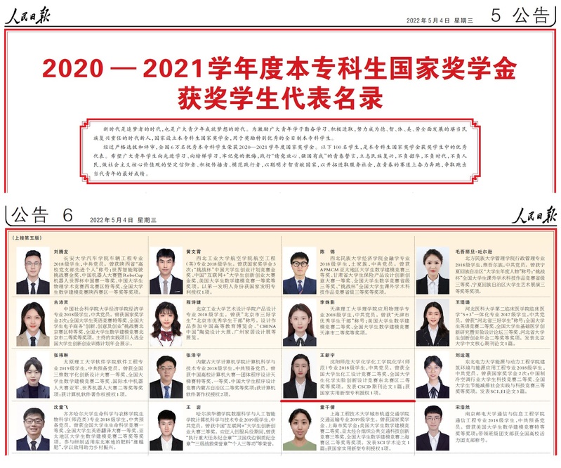 经过严格选拔和评审,全国6万名优秀本专科员工荣获2020—2021学年度国家奖学金。5月4日,人民日报从6万名获奖者中优中选优,刊登了100名优秀代表,公司304永利集团化学(师范)专业2018级本科生王新宇名列其中。据悉,辽宁省属本科高校只有2名获奖员工榜上有名。
