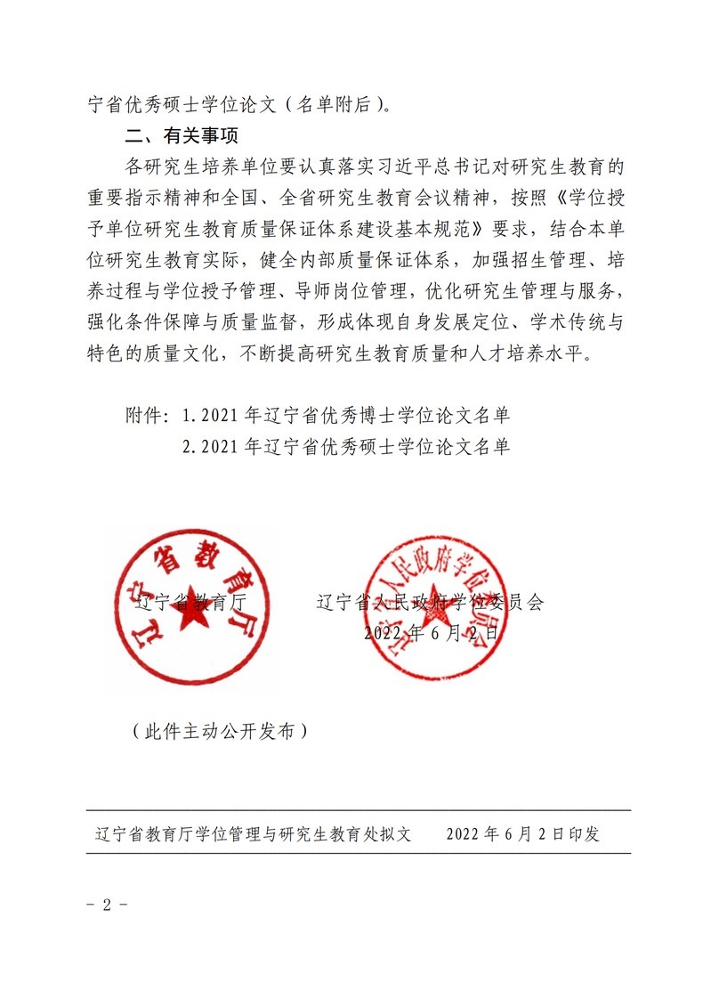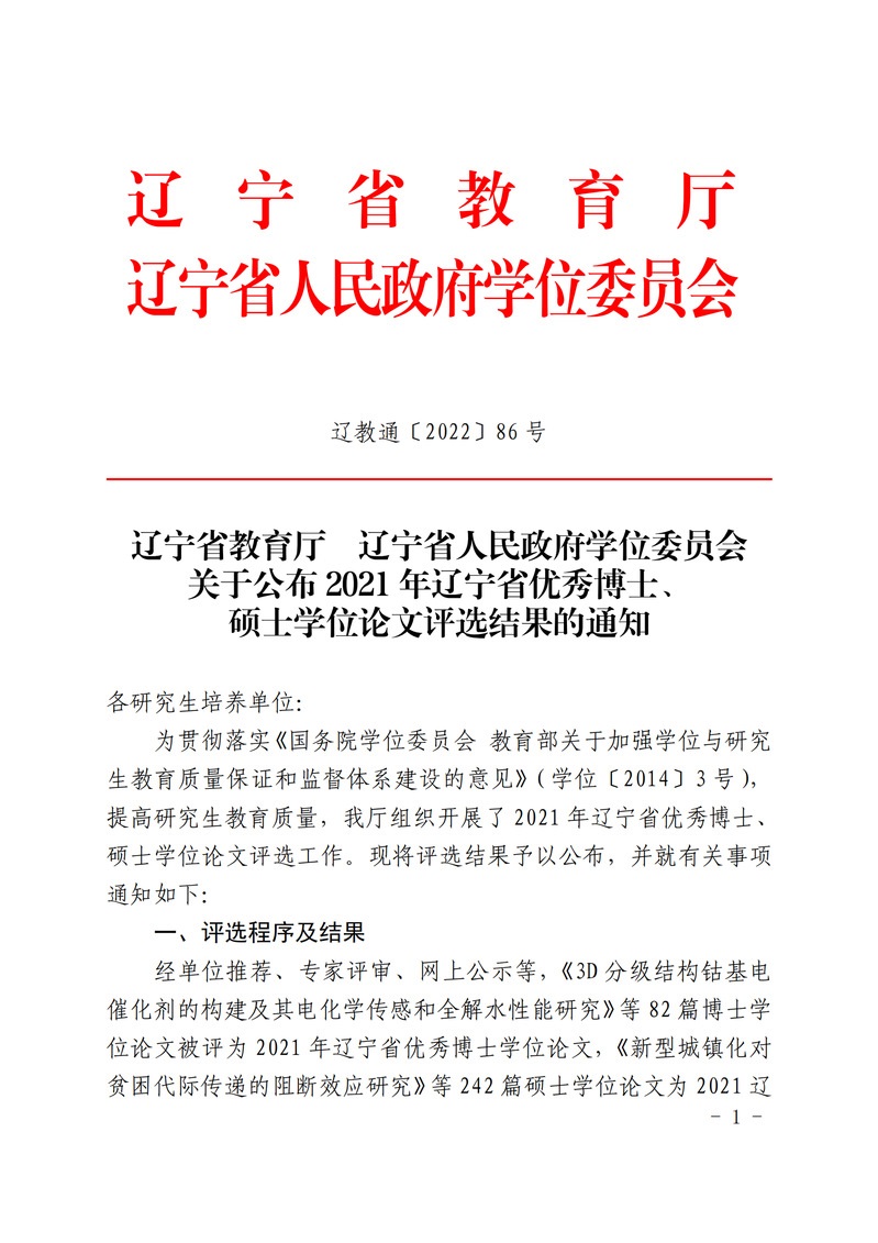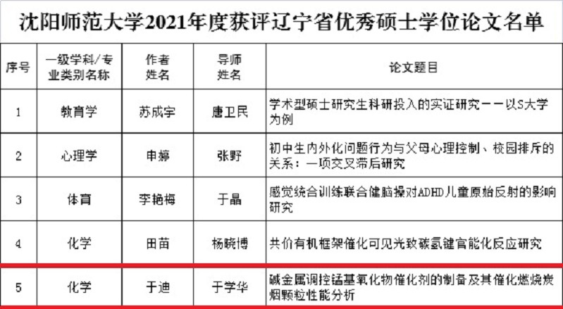 6月2日,辽宁省教育厅、辽宁省人民政府学位委员会正式下发了《关于公布2021年辽宁省优秀博士、硕士学位论文评选结果的通知》(辽教通〔2022〕86号),经过高校组织推荐,教育厅委托教育部学位中心论文送审平台组织权威专家评审、厅长办公会审议、网上公示等环节,公司教育学科唐卫民教授,化工学科杨晓博教授、于学华副教授,心理学科张野教授,体育学科于晶副教授等指导的5篇硕士论文,在全省众多参评论文中脱颖而出,获评2021年度辽宁省优秀硕士论文,使得公司优秀硕士论文总量在全省省属高校中居于前列。