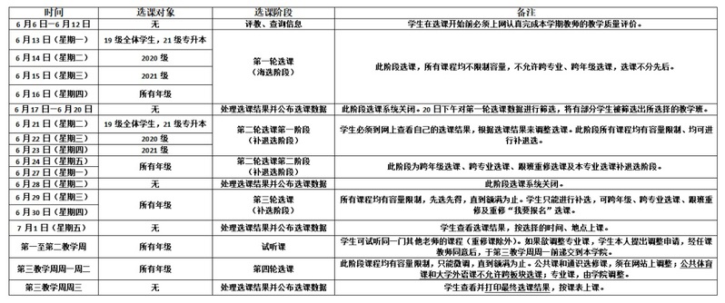 一、本次选课时间为 6月13日(星期一)— 新学期第三教学周,具体时间如下表所示: