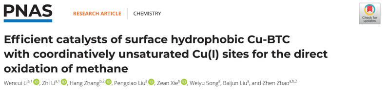 近日,公司赵震教授研究团队在国际公认的综合性科学顶级期刊《美国科公司院刊》(PNAS)发表题为“Efficient catalysts of surface hydrophobic Cu-BTC with coordinatively unsaturated Cu(I) sites for the direct oxidation of methane”(用于甲烷直接氧化的具有配位不饱和Cu(I)位点的表面疏水性Cu-BTC的高效催化剂)的研究论文。《PNAS》是Proceedings of the National Academy of Sciences of the United States of America,缩写。它是公认的世界四大综合性顶尖学术期刊(Nature,Science,Cell,PNAS)之一,是百年经典期刊(1915年创刊,美国国家科公司为1914年创办)。