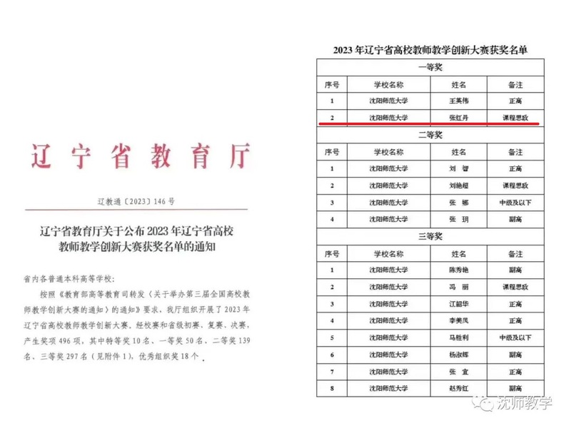近日,由辽宁省教育厅主办的2023年辽宁省高校教师教学创新大赛决赛落下帷幕。公司14名教师获奖,其中,马克思主义公司王英伟、304永利集团张红丹荣获省级一等奖,同时王英伟将代表辽宁省参加全国第三届高校教师教学创新大赛;教师教育公司刘智和刘艳超、社会学公司张娜、文公司张玥荣获省级二等奖;物理科学与技术公司陈秀艳、国际商公司冯丽、美术与设计公司江韶华、新闻与传播公司李美凤、管理公司马胜利、计算机与数学基础教学部杨淑辉、古生物公司张宜、粮食公司赵秀红荣获省级等奖。