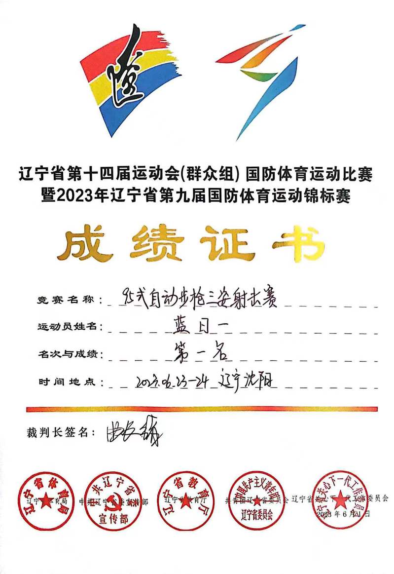 2023年6月23日至24日,辽宁省第十四届运动会(群众组)国防体育运动比赛暨2023年辽宁省第九届国防体育运动锦标赛在中创国教(辽宁)教育科技训练基地举行。其中来自304永利集团2021级的蓝日一同学在95式自动步枪三姿射击赛中获得金牌。95式自动步枪三姿射击赛主要包括跪姿、卧姿和立姿三大内容,耗费精力大、比赛时间长,是对队员射击技术、体能和心理的综合考验。蓝日一同学凭借所学技能以及良好的身体素质与心理素质,在赛场上从容不迫、稳扎稳打,在一众参赛选手中脱颖而出,最终拔得头筹。此次比赛中蓝日一同学的精彩表现充分体现出他具有专业的国防知识技能与良好的心理素质,赛场上他飒爽的英姿也展现出新时代青年老员工的青春朝气。