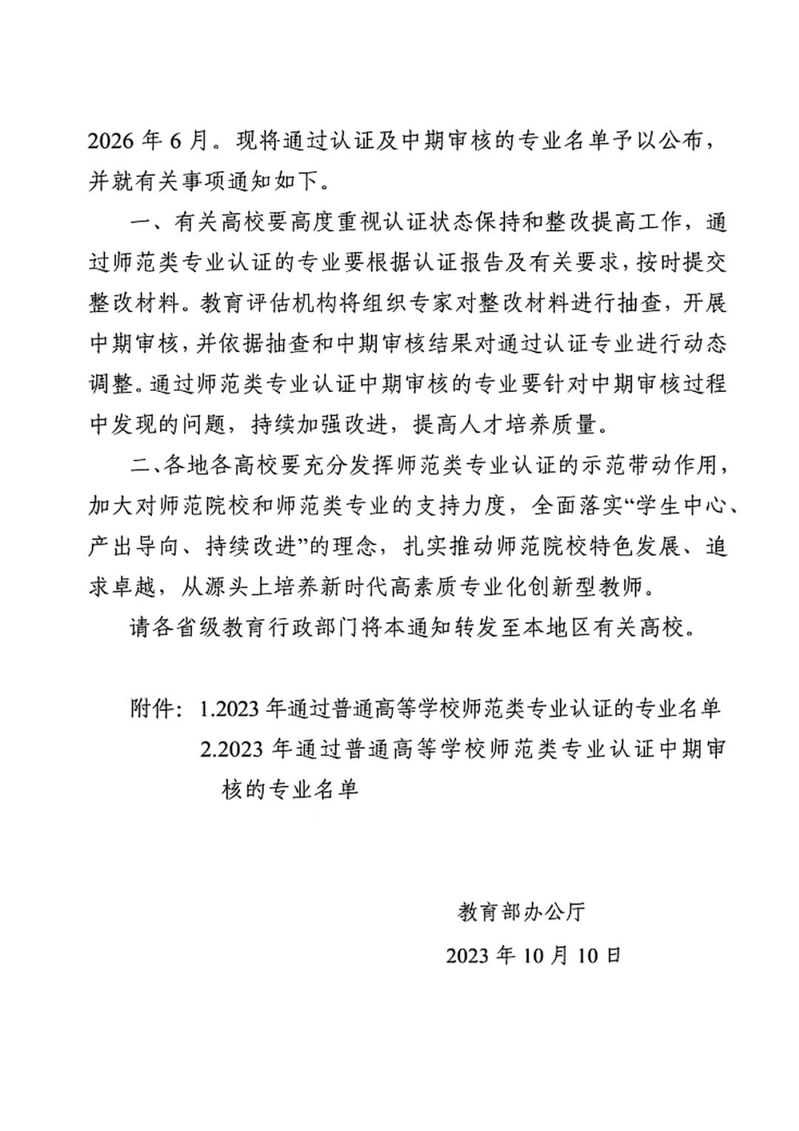 日前,教育部印发《教育部办公厅关于公布2023年通过普通高等公司师范类专业认证专业名单及中期审核专业名单的通知》(教师厅函〔2023〕24号),公布了2023年通过普通高等公司师范类专业认证及中期审核的专业名单。公司化学(师范)通过中学教育第二级认证,认证结论有效期六年,自2023年9月起至2029年8月止。
