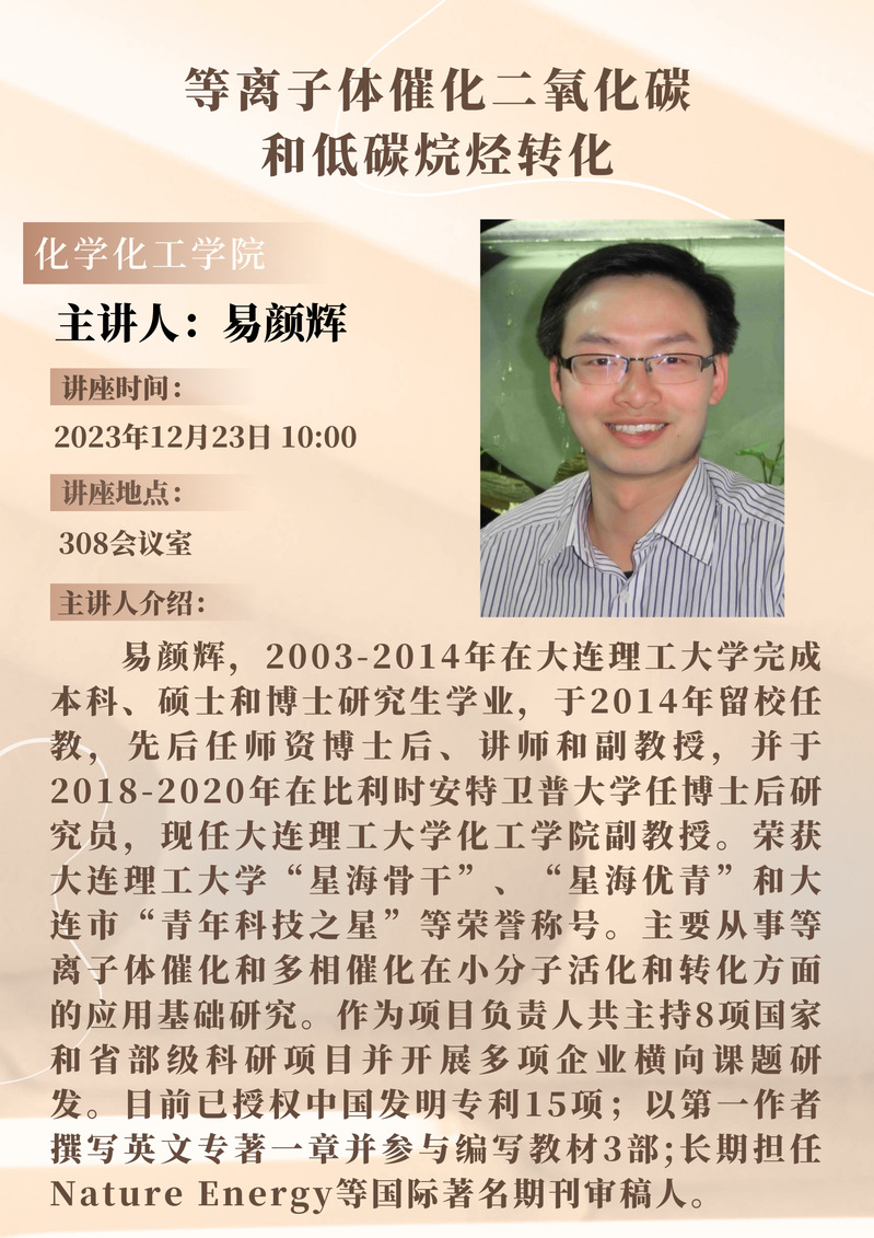 易颜辉副教授学术报告预告:等离子体催化二氧化碳和低碳烷烃转化