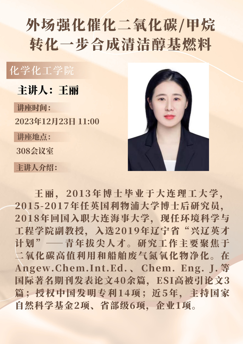 王丽副教授学术报告预告:外场强化催化二氧化碳/甲烷转化一步合成清洁醇基燃料