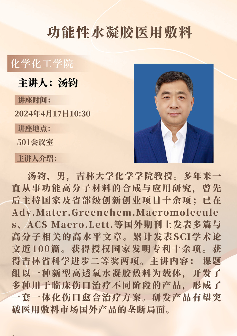 汤钧教授学术报告预告:功能性水凝胶医用敷料