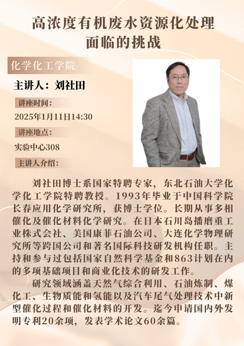 刘社田教授学术报告预告:高浓度有机废水资源化处理面临的挑战